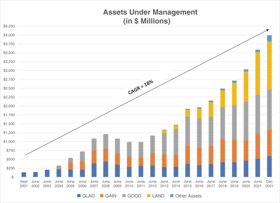 We have grown our assets under management significantly, from approximately $132.2 million as of September 30, 2001, to approximately $4.0 billion as of December 31, 2021, representing a compound annual growth rate (CAGR) of approximately 18%. Our Adviser Subsidiary oversees the investments of the four Existing Gladstone Funds which have collectively invested approximately $7.1 billion in 668 businesses or properties through December 31, 2021. As of December 31, 2021, we had 29 executive officers, managing directors and directors and also employed 48 other investment and administrative professionals. Our headquarters is in McLean, Virginia (a suburb of Washington, D.C.) and we have offices in New York, New York; Seattle, Washington; Dallas, Texas; Palm Beach Gardens, Florida; Brandon, Florida; Camarillo, California; Salinas, California; and Tulsa, Oklahoma.